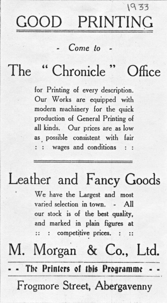 | 1906 | Abergavenny Chronicle & Monmouthshire Advertiser | H Morgan & Co Ltd | Kelly |