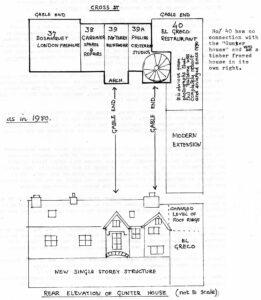 Both Bosanquet’s and Philips told me that the Cibi Brook runs underneath the building. Philips maintain that the corner of the pavement between 40 and 39A was raised recently and gave access to a brick lined culvert of considerable size. They seemed to think it ran diagonally from under No 40 and across the street towards the other side of the road. It is difficult to believe that the Gunter House was built on top of this stream – perhaps it just passed the corner of 39A before El Greco was added.