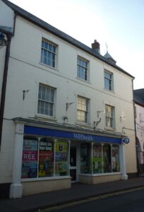 Listed Building Grade II in 1984: originally 17th century, refronted early 19th century. Tall 3 storey frontage with centre and right hand pilasters incised coursing and plain band to stucco on left, pebble dash to right. Slate roof, boxed out eaves, brick stack to left gable which is slate hung, rubble and brick to right gable end. Three windows, double hung sashes with glazing bars, windows to first floor with decorative margins and key blocks. Overall modern fascia to spearate shop fronts, 19th century double fronted shop with slender columnettes to left. Twin storey gabled ranges at the rear with cemented walls and upper casement windows. W Wing has roof timbers with “wern hir” stops (Fox & Raglan). Remains of stone tiles under present slated roofs.