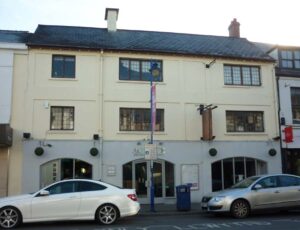 A/144 1985 Abergavenny Chronicle Oct 7th 1949. This shows a drawing of Frogmore Street with a small house, prior to the building of the archway on the left of the present building.