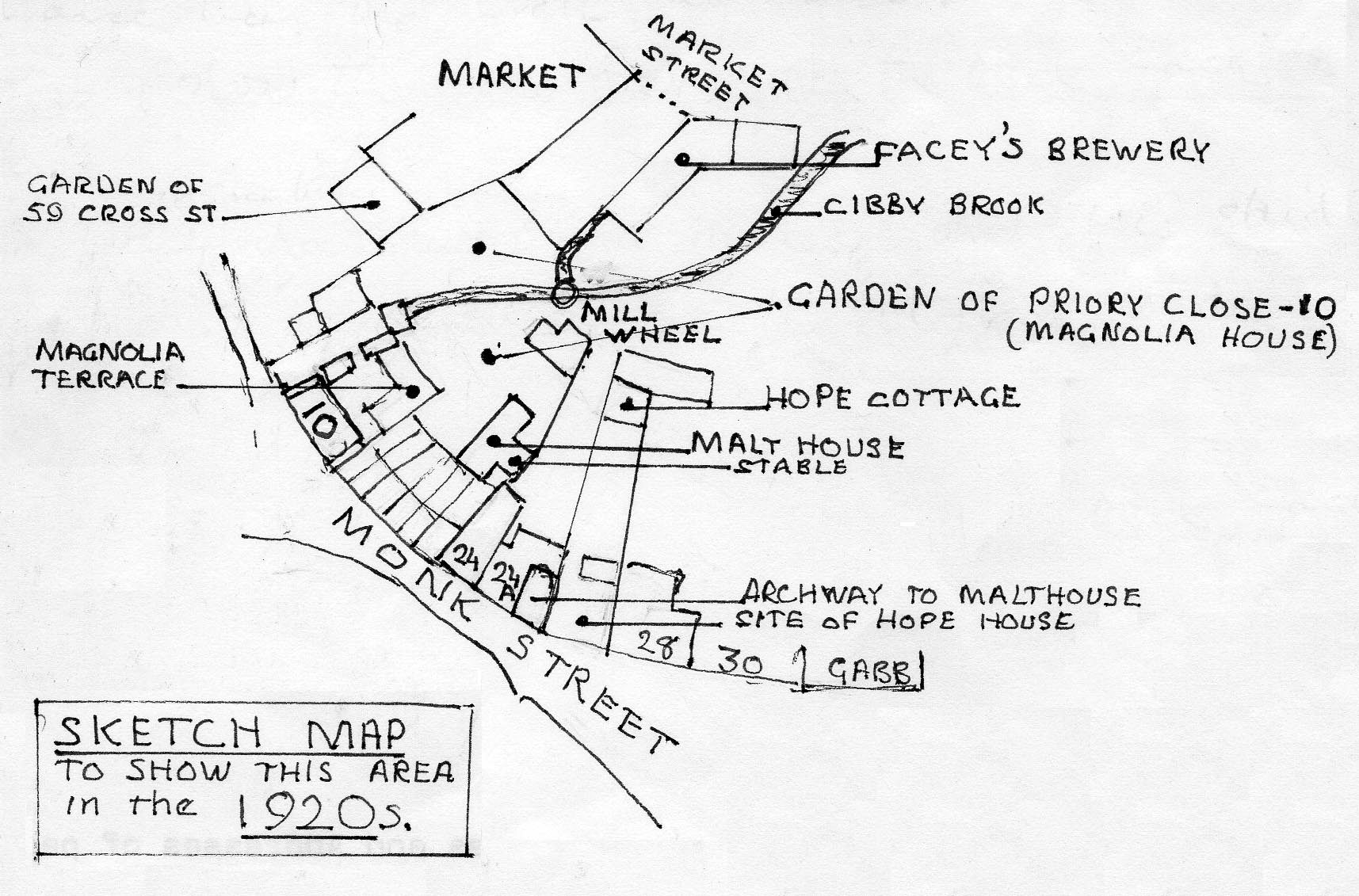 The house is said to have been owned by a miller and there was a hoist for grain from the 2nd floor window above the door. Source: Mr Dorrell. See sketch map below.